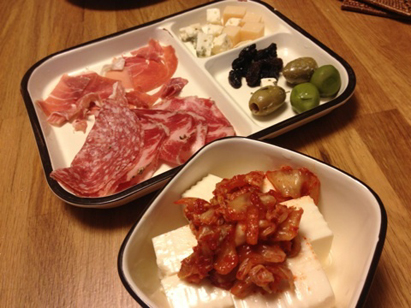 atsukoさんが持って来てくれた『生ハム・オリーブ・チーズの詰め合わせ』とelfin作『お豆腐キムチのせ』